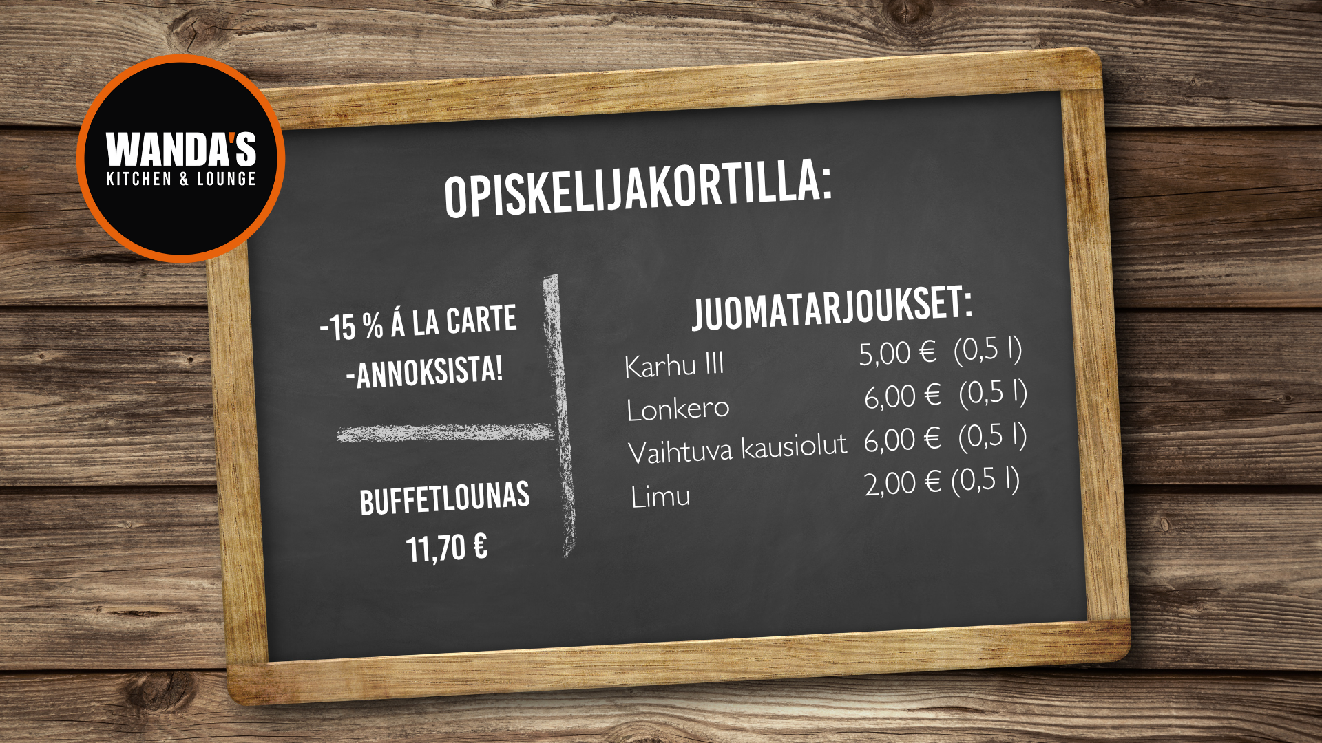 -15 % alennus kaikista à la carte -annoksistamme sekä hanajuomat opiskelijahintaan.